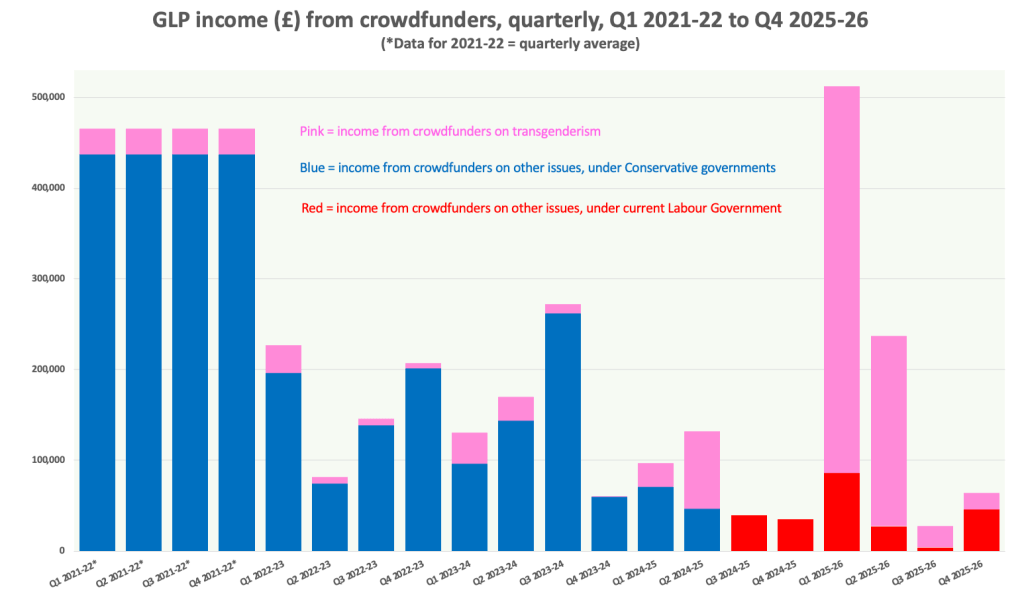 Things picked up somewhat in November, with the launch of not one, not two, not three but four new crowdfunders, including one in support of the GLP’s first significant legal challenge to Keir Starmer’s Labour Government. But, three months on, all four of those crowdfunders appear to have run out of steam, at least for the time being, and in January total income from the GLP’s 11 open crowdfunders – including yet another new one, launched on 30 January – was a modest £17,479.