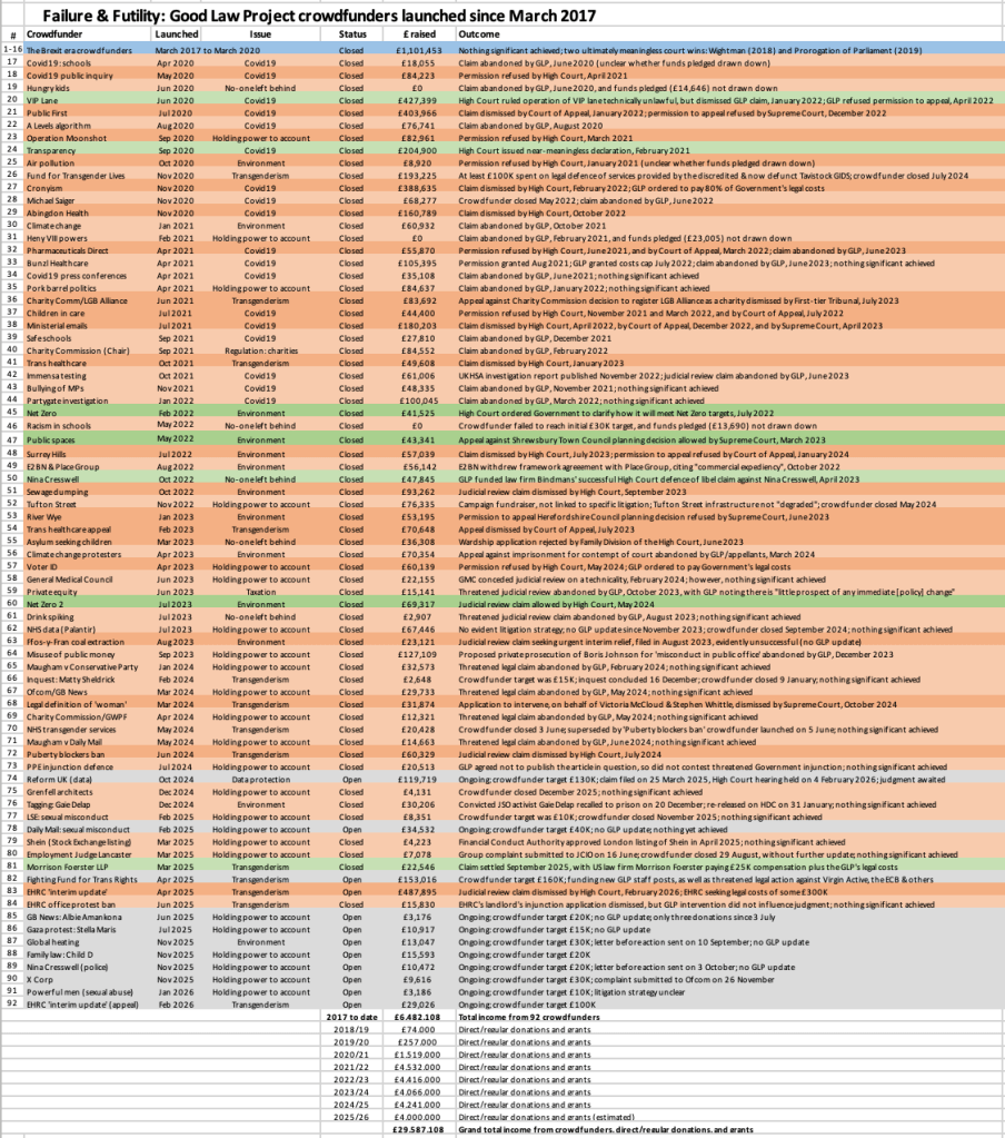 Of course, such crowdfunding constitutes only one of the GLP’s various income streams, with most income coming from regular, direct donations. But the launch of 15 new crowdfunders in 2025-26 – three more than in both 2024-25 and 2023-24 – suggests that crowdfunding of their litigation remains an important tool for Maugham and the GLP.