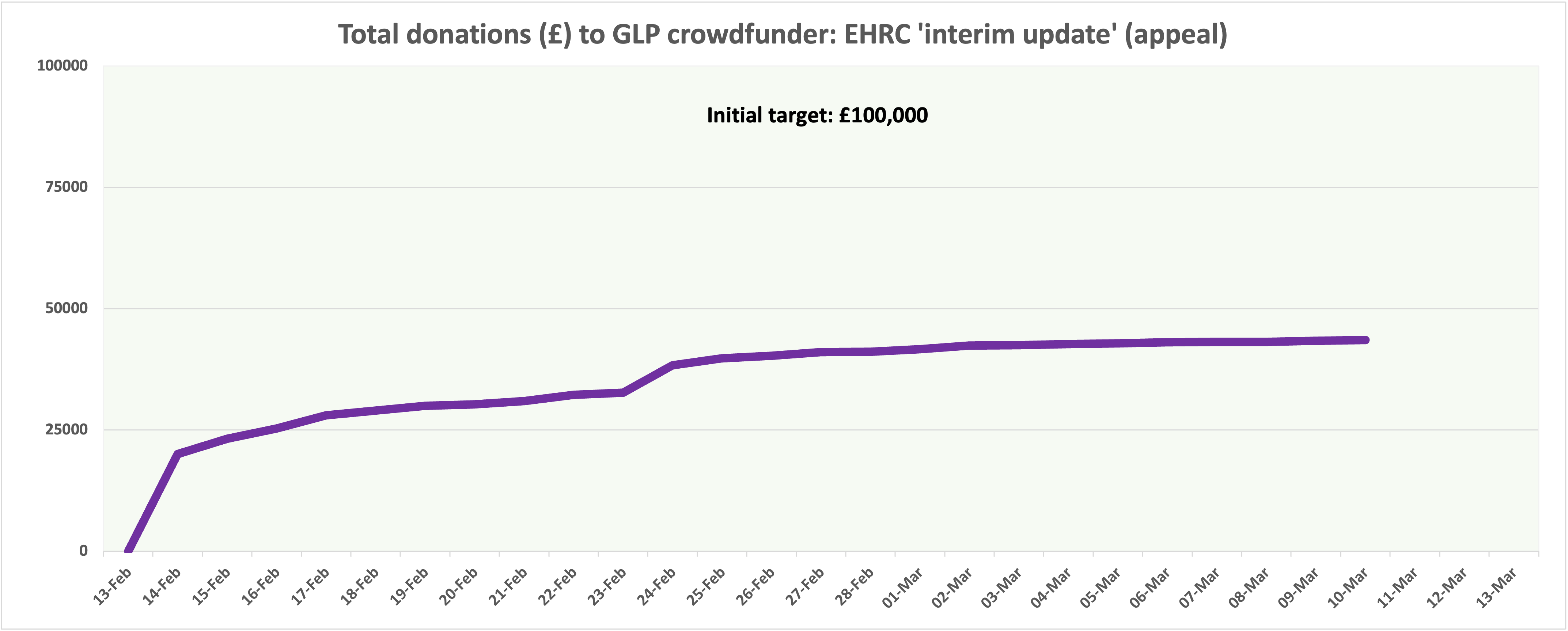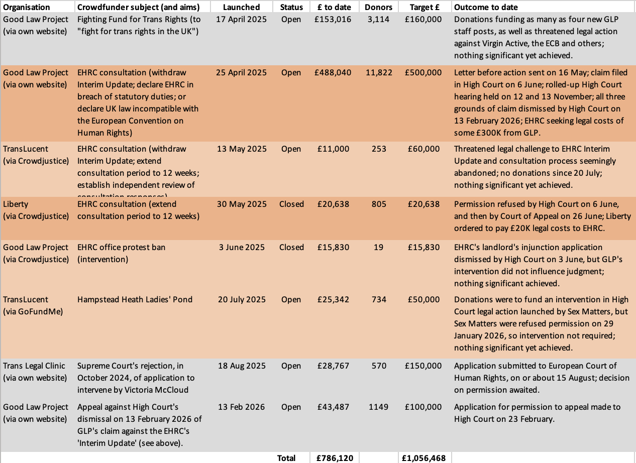 However, 2026 hasn’t started brilliantly for Maugham and the GLP, what with the High Court comprehensively dismissing their legal claim against the Equality & Human Rights Commission’s ‘interim update’ on the April 2025 Supreme Court ruling – a claim for which they had, by the day of the ruling, 13 February, pointlessly crowdfunded a stonking £487,859 from 11,816 donations. And the EHRC are now seeking legal costs of almost £300K from the GLP. Ouch.