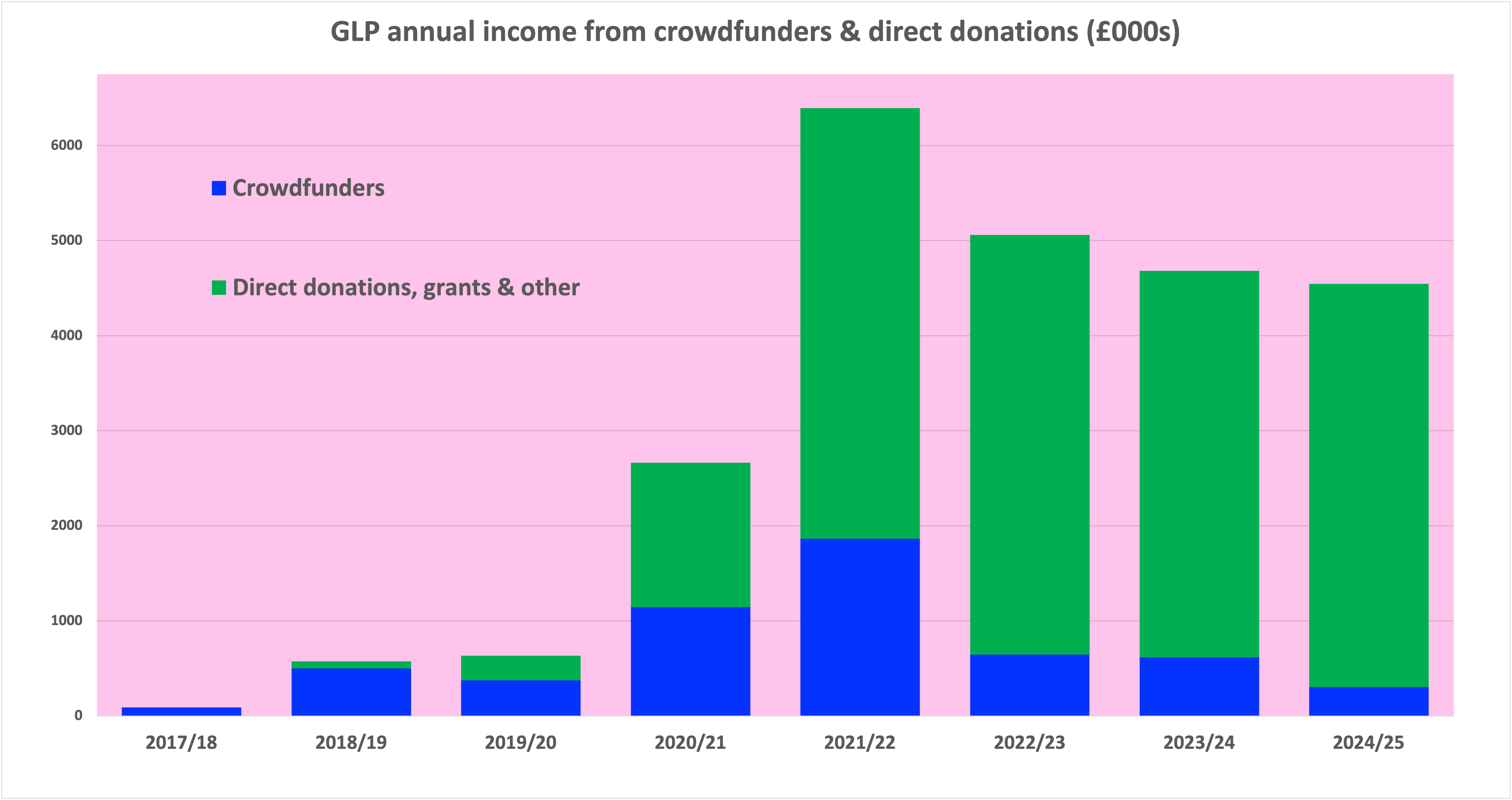 Meanwhile, the GLP’s income from crowdfunders plummeted, from some £450,000 per quarter in late 2021, to some £200,000 per quarter in late 2022, and just £40,000 per quarter in late 2024, after the demise of their Tory cash cow. And the GLP’s woeful record of ‘success’ in actually changing public policy continued.