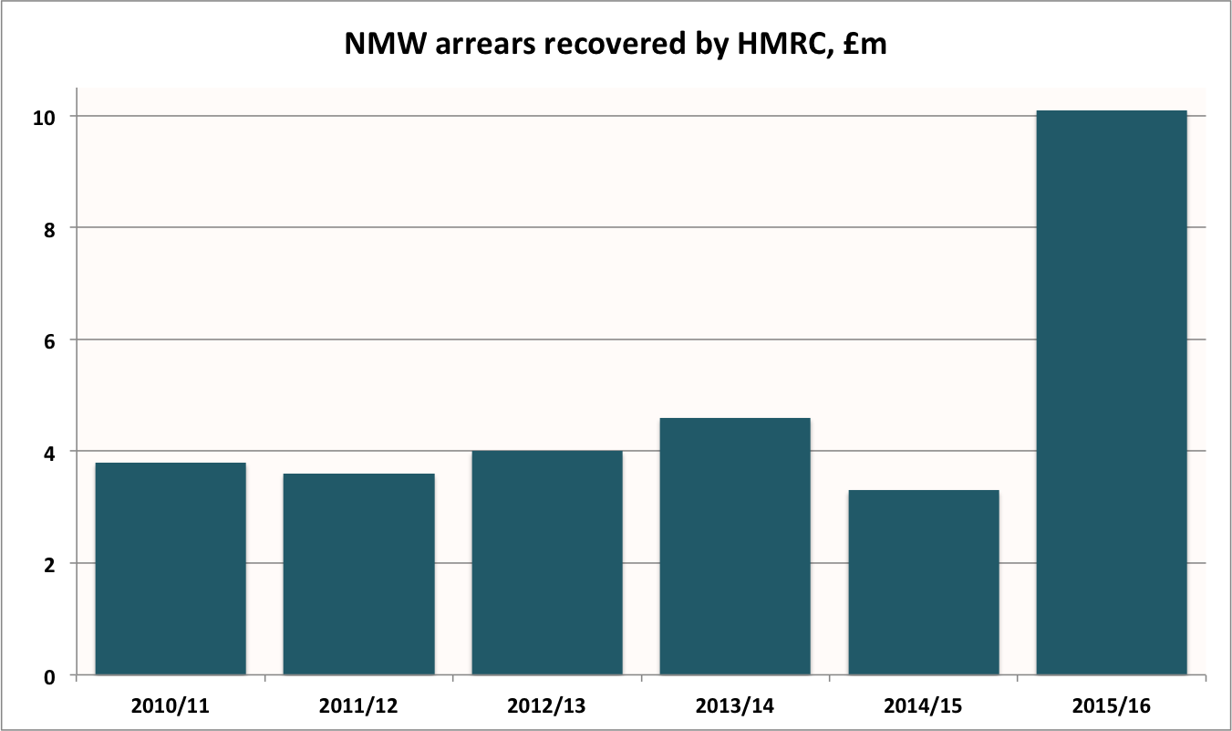 This is to be welcomed. But – as previously noted on this blog – it also begs a question: how did this stonkingly good performance by HMRC come about? For it is not easily explained by previous, much less dramatic increases in the HMRC enforcement team’s budget. Could it possibly have something to do with the (effective) amnesty for NMW rogues that BIS quietly announced in the summer of 2015? We really should be told.