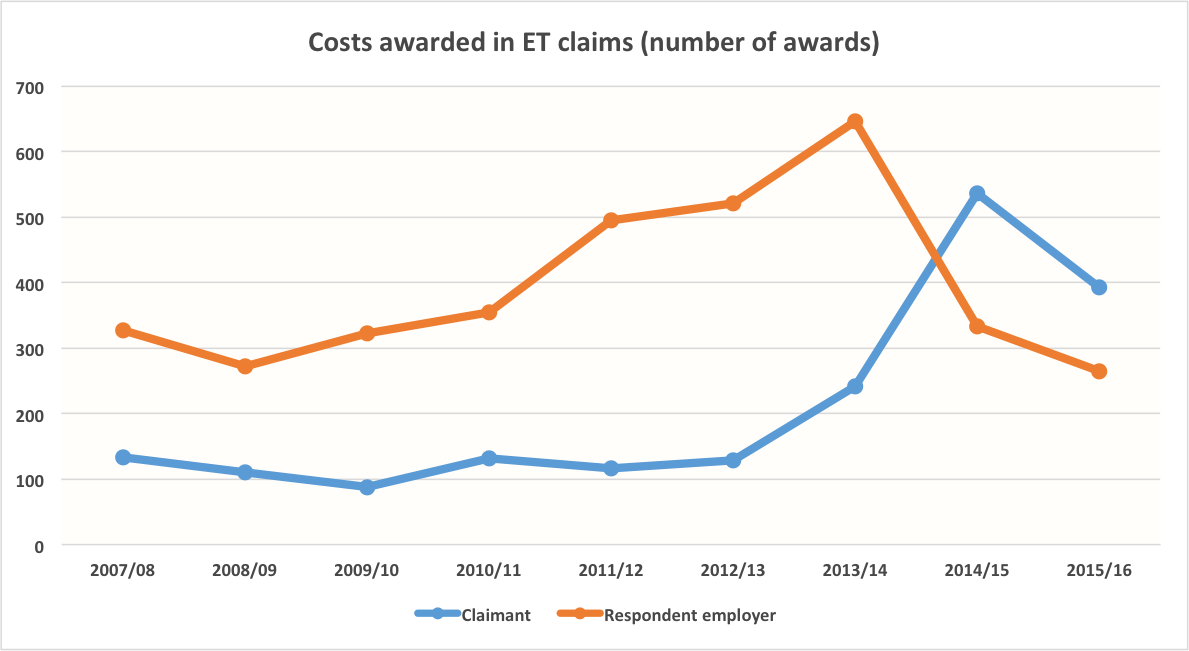 Update (23 September): So, barrister Jamie Anderson was first (on Twitter, last night) to suggest what looks to me to be the explanation, closely followed by Sophie Park (see comments, below): the data for costs awards to claimants from 2013/14 onwards includes orders made under Regulation 76(4) of the 2013 Regulations in respect of the repayment of fees, as well as standard costs awards made under Regulation 76(1). Which is a bit silly, really, and maybe someone could suggest, at the next ET User Group meeting, that such orders/awards be recorded separately from standard costs awards.