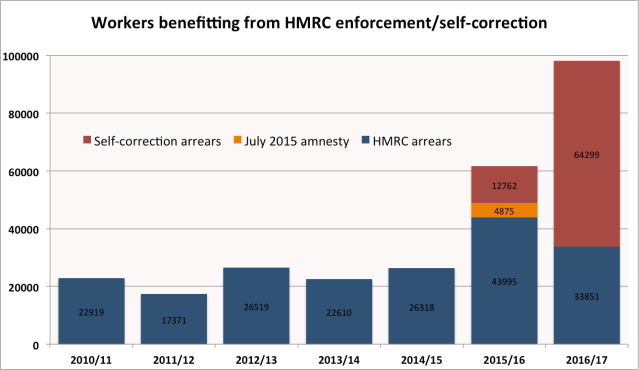 More interestingly, and as with both the February 2017 and August 2016 rounds of naming & shaming, what the BEIS press release failed to say is that 48 of the 233 employers also paid further arrears of £1.27 million, to 18,201 workers, under the so-called self-correction mechanism quietly introduced by BEIS/HMRC in 2015. This information was only elicited by a written Parliamentary Question by Caroline Lucas MP (aka my boss).