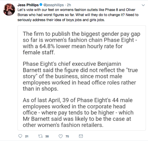 In the circumstances, it seems harsh if not grossly unfair to pick on – and call for a consumer boycott of – a company that, given the nature of its business and customer base, seems to be working reasonably hard to avoid having an arguably near-inevitable gender pay gap. As Maya Forstater, visiting fellow at the Centre for Global Development, noted in response to Jess’s call for women to boycott the retailer Phase Eight, along with Oliver Bonas, Phase Eight is a “boutique-style women’s fashion retailer with high customer service – few staff in each store, bringing alternative sizes into changing room, giving opinion on outfits etc. – how many men want the job?” And there is absolutely nothing in the gender pay gap data to suggest that there is any unequal pay at Oliver Bonas (or, on the face of it, at Phase Eight, but I am resisting commenting on that company as I have not delved into their data or GPG report).