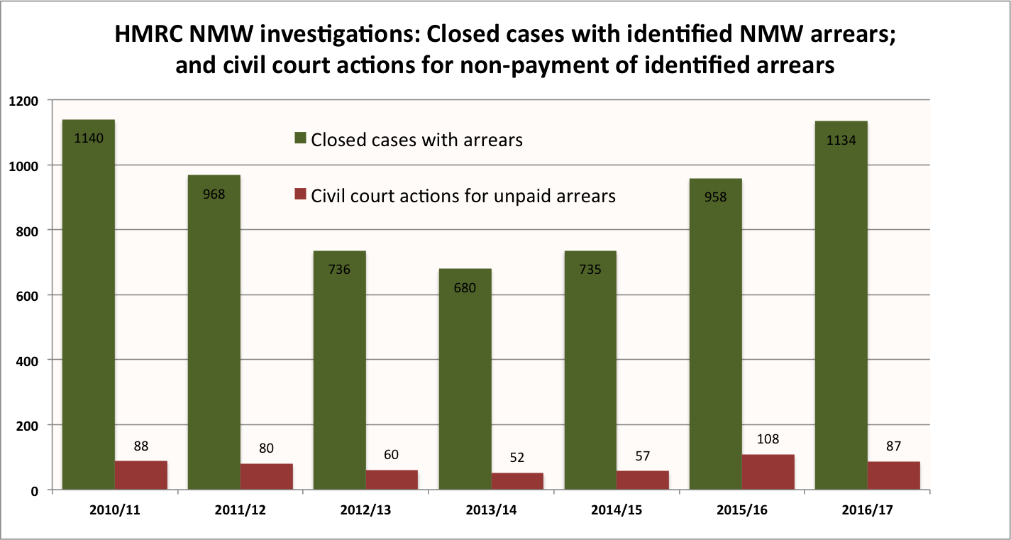 Cue further Parliamentary Questions by Caroline Lucas MP, and we learnt last week that, since 2010, HMRC has initiated civil court action for non-payment of identified NMW arrears against no fewer than 532 employers. However, HMR is unable to say how much was recovered in total by this legal action, or – somewhat incredibly – even how many of the 532 civil court claims resulted in the recovery of unpaid NMW arrears. Perhaps the National Audit Office should ask, next time they are in HMRC.