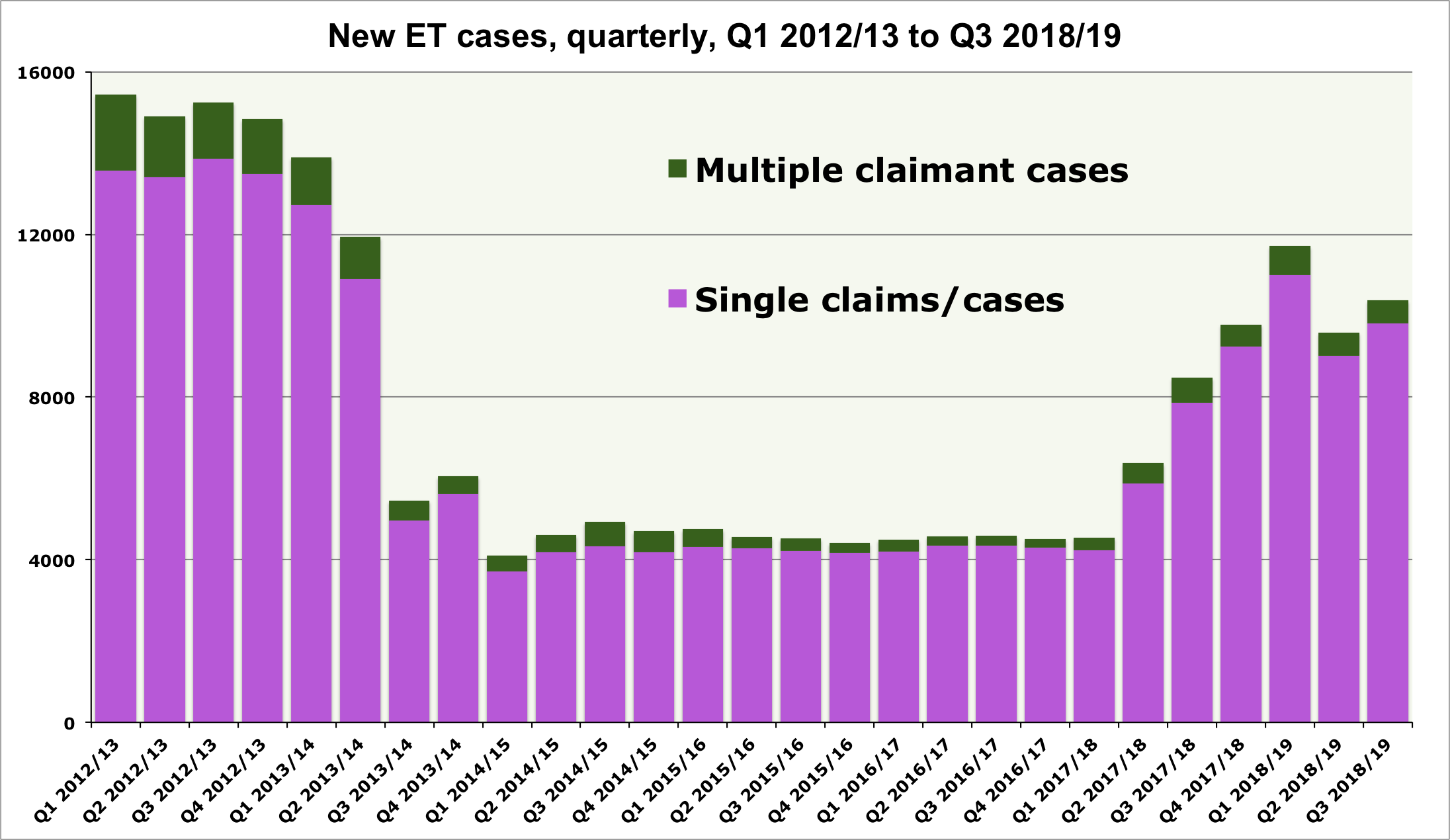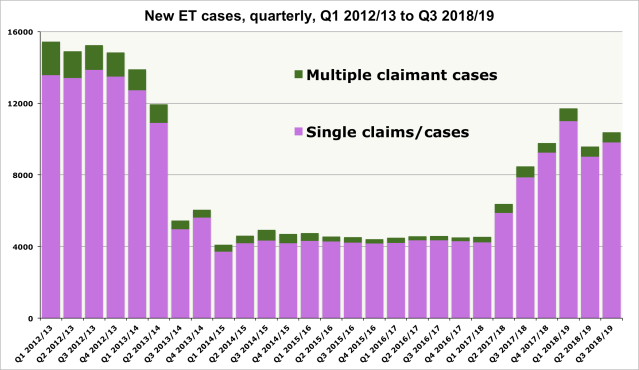 Nine months ago, in June 2018, I noted on this blog that Employment Tribunal (ET) claim/case numbers had still not settled at a new, post-ET fees normal. Having seemingly stabilised in Quarter 3 of 2017/18, the numbers had then increased again in Quarter 4.