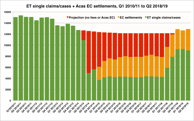 Some of those cases settled by Acas were multiple claimant cases, so for the following adaptation of the chart above, which shows single claims/cases, I have reduced the number of EC settled cases by 10%, before adding them to the number of ET claims/cases.