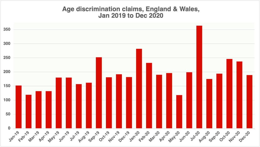 Because, if we look at what happened, month by month, in England & Wales in 2019 and 2020, we can see that much of that 30% increase occurred in January, February and July 2020. And there certainly won’t have been any impact of Covid and the lockdowns on the number of age discrimination claims in January and February 2020, as the first lockdown only started on 23 March.