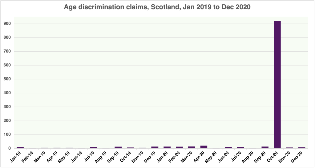 “Since publishing, People Management has learned there was a spike of 920 age discrimination complaints made in Scotland in October 2020 – accounting for a quarter of all age discrimination complaints made last year – which could be attributed to coordinated public sector claims following a 2018 Court of Appeal ruling on pensions.