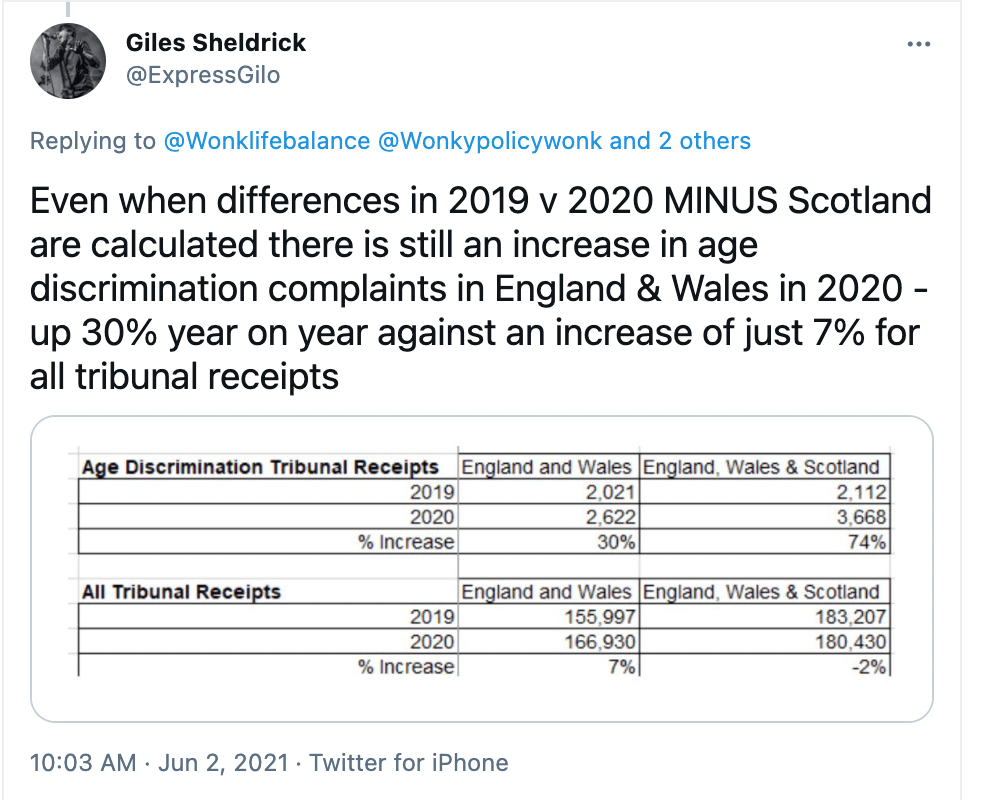 On Twitter, Giles Sheldrick of the Daily Express has sought to defend his numptiness by (a) conceding that age discrimination claims rose by just 30% in England & Wales in 2020, not 74% as stated in his article; and (b) asserting that the total number of jurisdictional complaints [sic] rose by 7%, whereas in his article he stated that this number (which he wrongly referred to as “overall cases”) had fallen from 183,207 to 180,430 (a drop of 2%). In short, in just 24 hours he’s gone from contrasting an increase of 74% with a decrease of 2% (a difference of 76 percentage points), to contrasting an increase of 30% with an increase of 7% (a difference of just 23 percentage points).