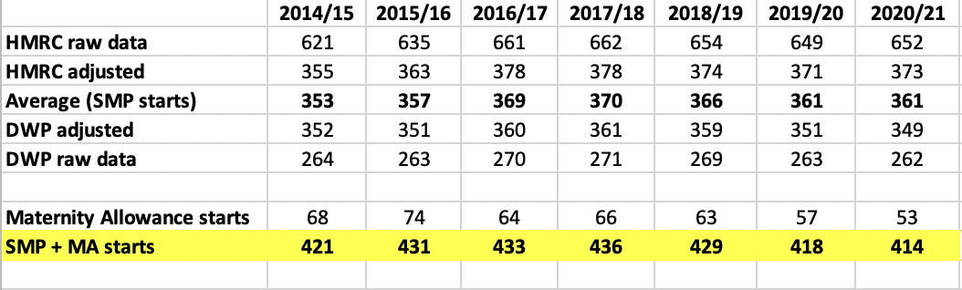 Then, in late October, the DWP confirmed to me (in response to my Freedom of Information request FOI2021/79684) that their data on SMP caseload understates the number of women who start on SMP each year, as the data is average caseload at any point in time, not total caseload over the year.