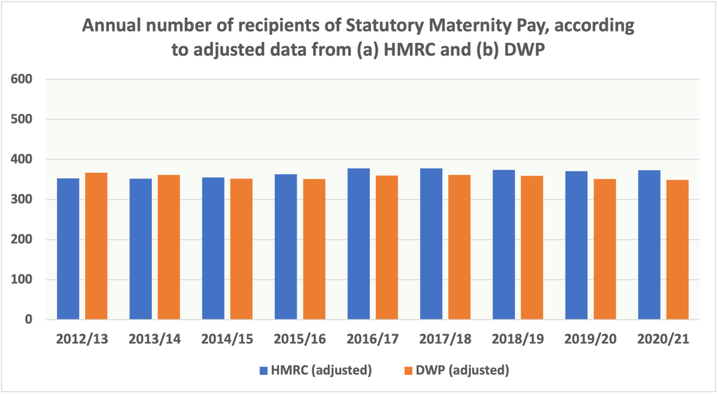 We have known for some years that the figure must be wrong, because there are two sets of official data on recipients of Statutory Maternity Pay (SMP): one unpublished but provided by HMRC in response to numerous Freedom of Information requests in recent years, which is where the figure of ‘about 650,000’ comes from, and one published by the Department for Work & Pensions (DWP). And, as the following chart shows, the figures in those two data sets are not just different – they are very different: