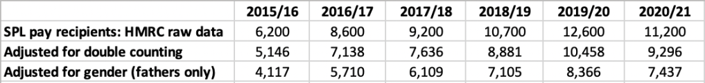 And we do already know that the SPL scheme has been a monumental failure, overall, because we know that the number of eligible new fathers who have experienced the joys of taking Shared Parental Leave since 2015 is extremely small. According to raw data provided by HMRC in response to numerous Freedom of Information requests in recent years, just 12,600 people [sic] received statutory SPL pay in 2019/20, the fifth year of the SPL scheme. But HMRC has also confirmed both that this raw annual data is inflated by a degree of double counting, and that some 20% of the recipients are female (presumably either a lesbian partner of the birth mother, or the birth mother herself). And, if we adjust the raw data accordingly, to focus on the male recipients (i.e. on fathers), that extremely small number gets even smaller: