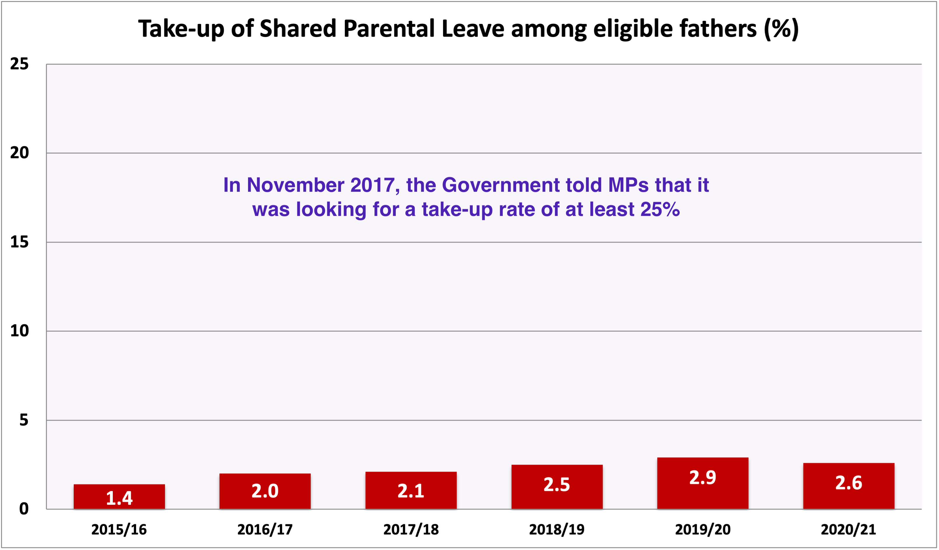 A take-up rate among eligible fathers of even 5.6% is still well short of the Government’s stated target of 25%. So the evaluation report will most likely attempt to recycle the Coalition Government’s original, remarkably unambitious 2013 forecast – based on the findings of a telephone survey of parents conducted eight years previously, in 2005 – of 2-8% of eligible fathers. But the fact is that, four years later, in November 2017, the then business minister told the Women & Equalities Committee of MPs that the Government has a target of 25% of eligible fathers. And with good reason – a rate of take-up of just 2-8% among a (heavily) restricted pool of eligible fathers will not change the world.