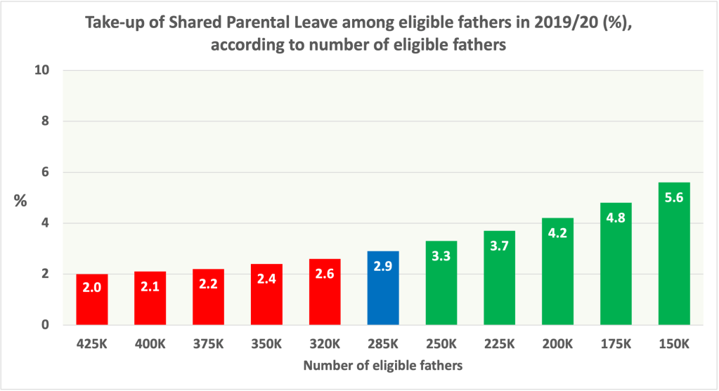 Unfortunately, pending the evaluation report, there is a problem with using this (adjusted) HMRC data to estimate the rate of take-up of SPL among eligible fathers: we simply do not know how many eligible fathers there are each year. In 2013, in its impact assessment of the new policy (see Table 7 on p29), BEIS forecast the maximum number of eligible fathers to be 285,000 (a figure BEIS has never felt the need to revise). And using that figure as the denominator suggests a rate of take-up among the pool of eligible fathers of just 2.9% in 2019/20, well short of the Government’s stated target of 25%: