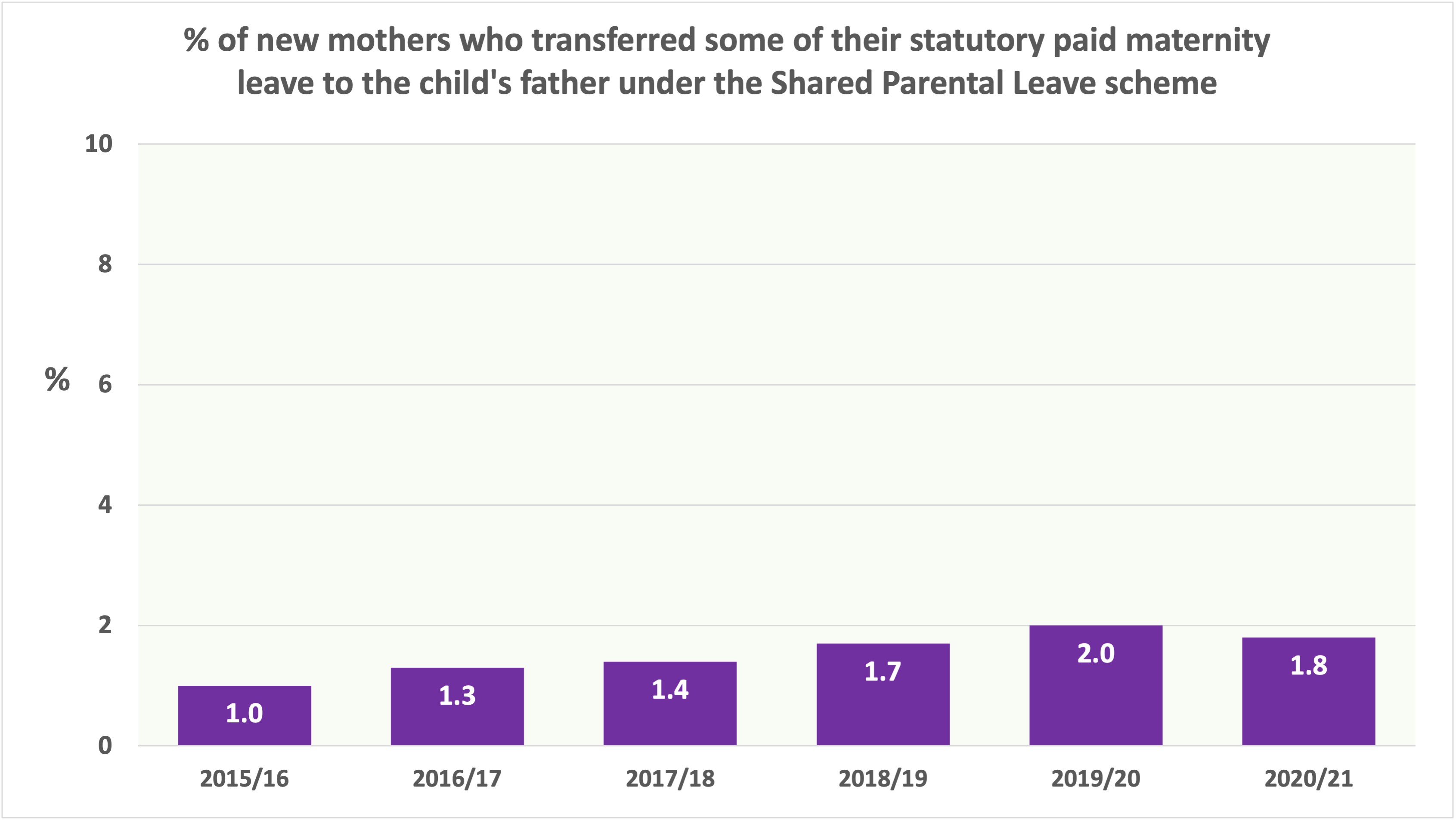 Indeed, rather than focus on take-up among the limited pool of eligible fathers, it is arguably more meaningful to use the same HMRC data on recipients of SPL pay, adjusted for double counting and gender, to generate figures for the proportion of new mothers who, having started on statutory paid maternity leave, use the SPL scheme to transfer some of that paid leave to the child’s father. For it is this proportion, rather than the rate of take-up among the (limited) pool of eligible fathers, that tells us most about the impact of the SPL scheme in driving a societal shift towards more equal parenting.