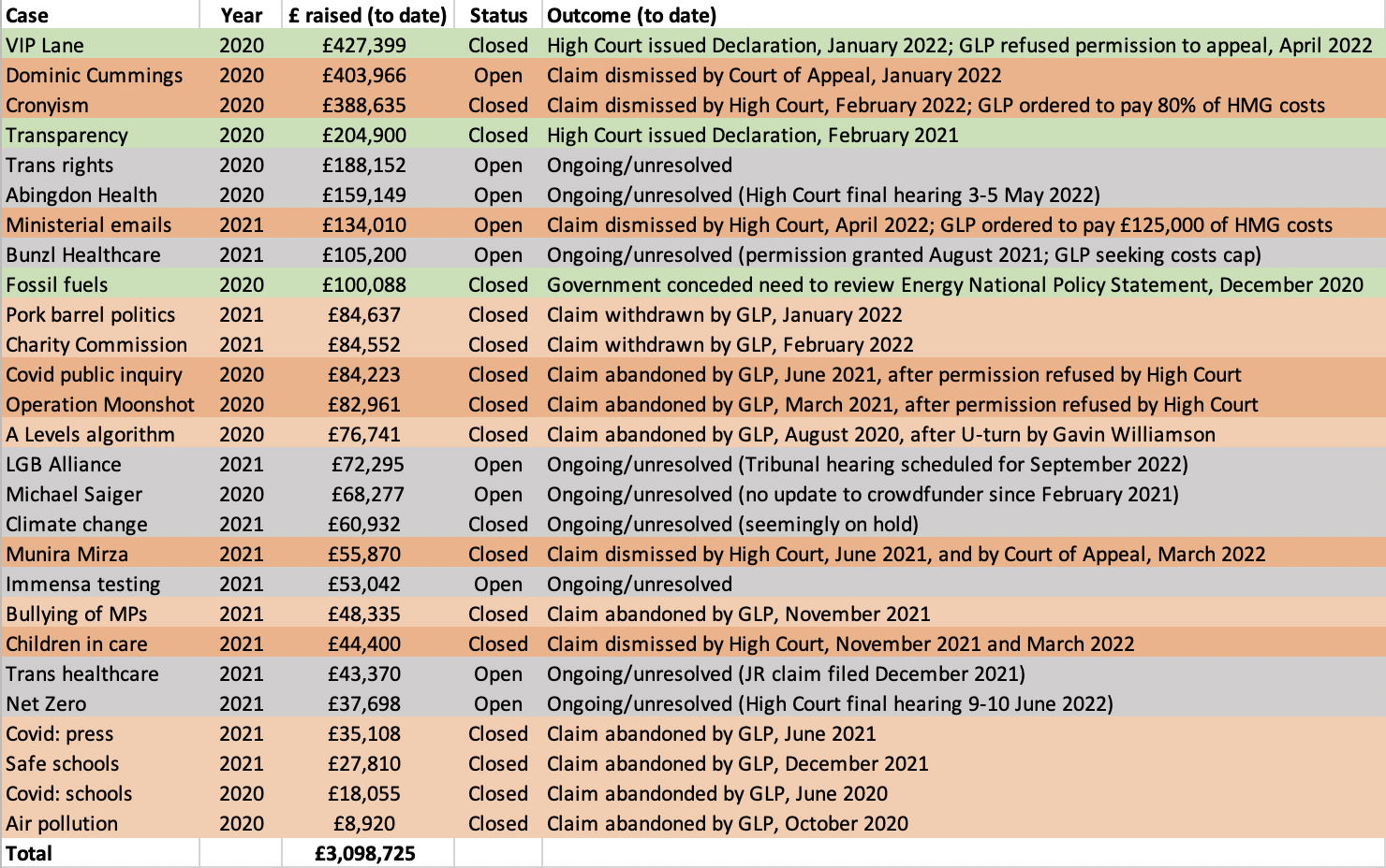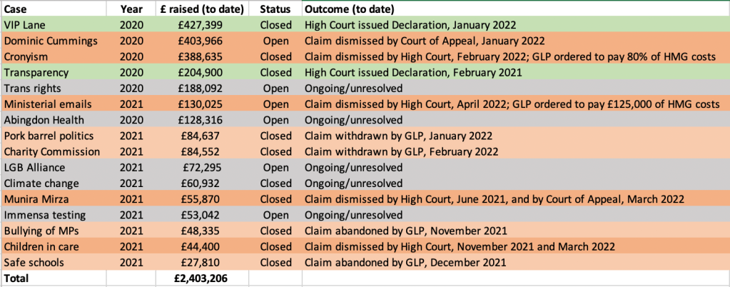 This claim was heard by the High Court on 22-24 March, and in the weeks ahead of the hearing the GLP had bigged up the associated Crowdjustice crowdfunder – launched in July 2021 and one of 16 launched by the GLP in 2020 and 2021 – in emails to its signed-up supporters and on social media, raising the total from £76,818 on 18 February, to £118,211 by 22 March, when the crowdfunder was (temporarily) closed. Now, all of that money will simply be handed over to the Government that Jolyon and the GLP claim to be holding to account.