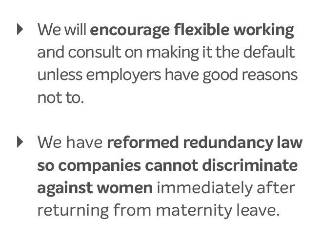 In December 2019, the Conservative general election manifesto (see pp 37-39) promised a consultation on making flexible working the default, and falsely claimed that the Government has already acted on the (still outstanding) July 2019 pledge to reform redundancy protections. The flexible working consultation was eventually held between 23 September and 1 December 2021, but it was clear from the consultation document that the Government has abandoned any idea of making flexible working the default.