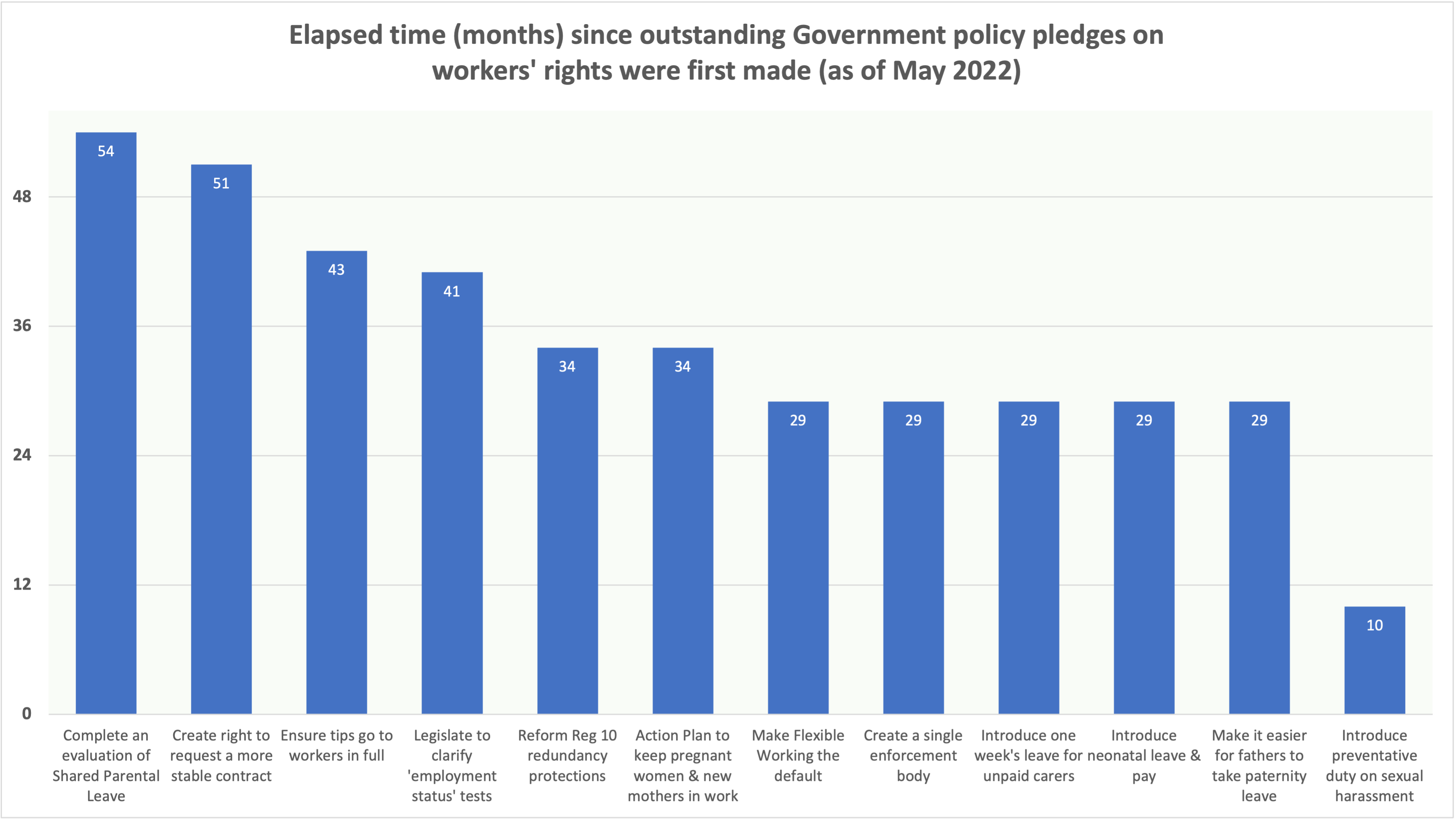 We’ve known for some weeks that the Queen’s Speech is unlikely to include the repeatedly promised ‘Big Bus’ Employment Bill but, as noted previously on this blog, that doesn’t necessarily preclude there being one or more smaller legislative vehicles delivering some of these outstanding policy pledges. Because, as the following chart shows, some of these policy pledges have been outstanding for some considerable time.