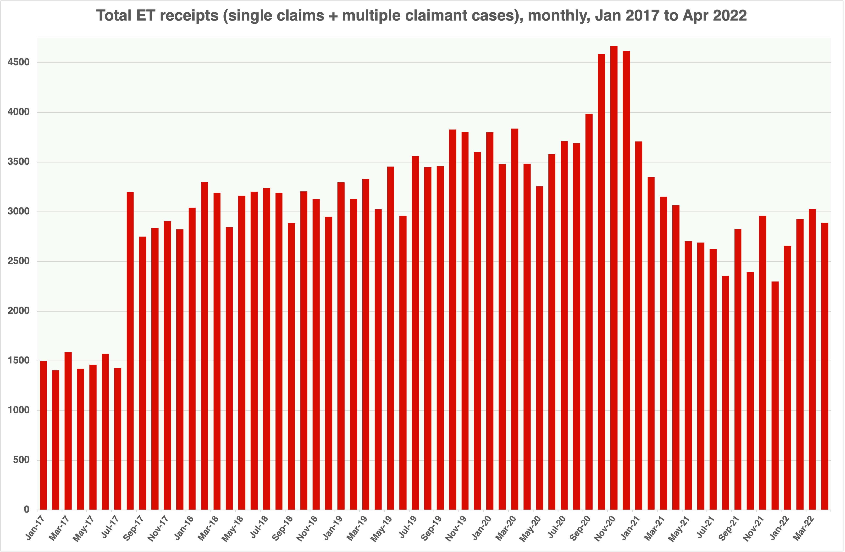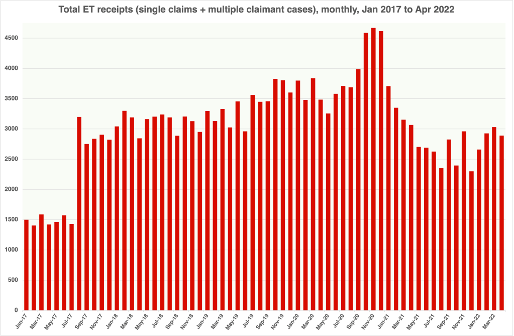 Well, yesterday HMCTS not only included some data on both Employment Tribunal receipts and disposals in the latest set of quarterly tribunal statistics, up to March 2022, but also published some new monthly management information up to April 2022. And this confirms not only that the number of new cases did indeed fall by 42% between November 2020 and May 2021, but that it continued to fall further: in December 2021, the number of new cases (2,298) was 51% down on that in November 2020 (4,669). And we have to assume that HMCTS is now pretty confident of the reliability of these figures – so, sorry for doubting you, HMCTS peeps.