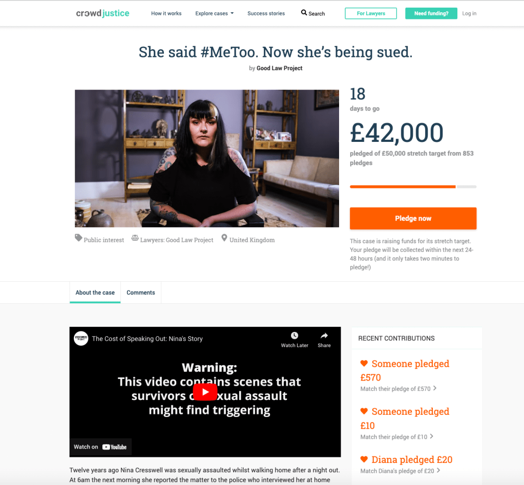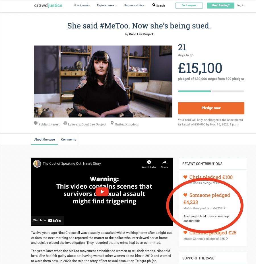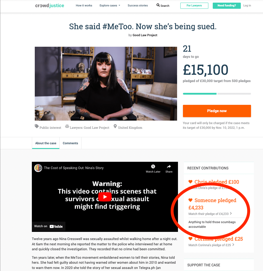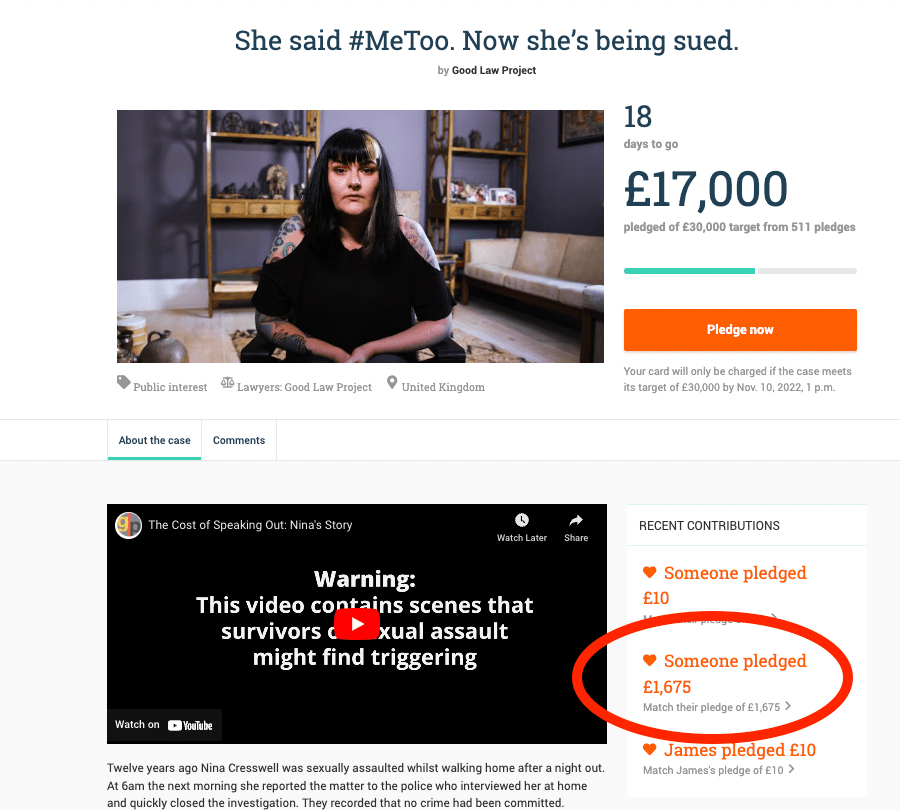 On 11 October 2022, the GLP launched a new crowdfunder – their 50th – in support of legal action on behalf of Nina Cresswell, who is being sued by a man she has publicly accused of sexually assaulting her 12 years ago. This stated that “so far we have spent £8,583 of our own funds getting legal advice for [Ms Cresswell], and defending her in court will cost a further £50,000”. And it set out an initial target of £30K, to be met within 30 days: “Your card will only be charged if the case meets its target of £30,000 by 1pm [on 10 November 2022]”.