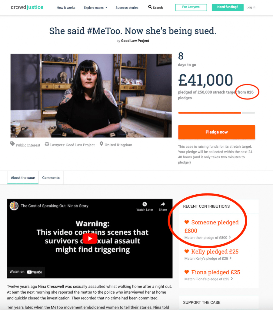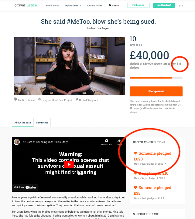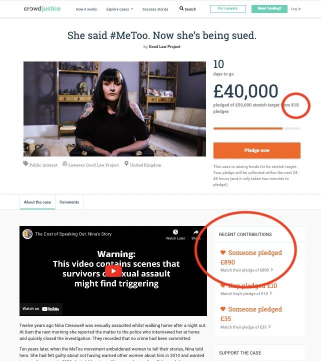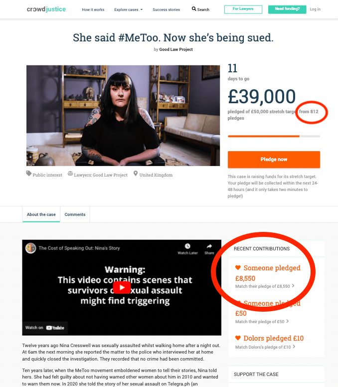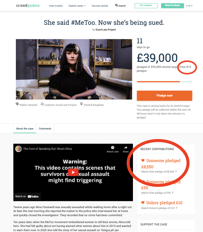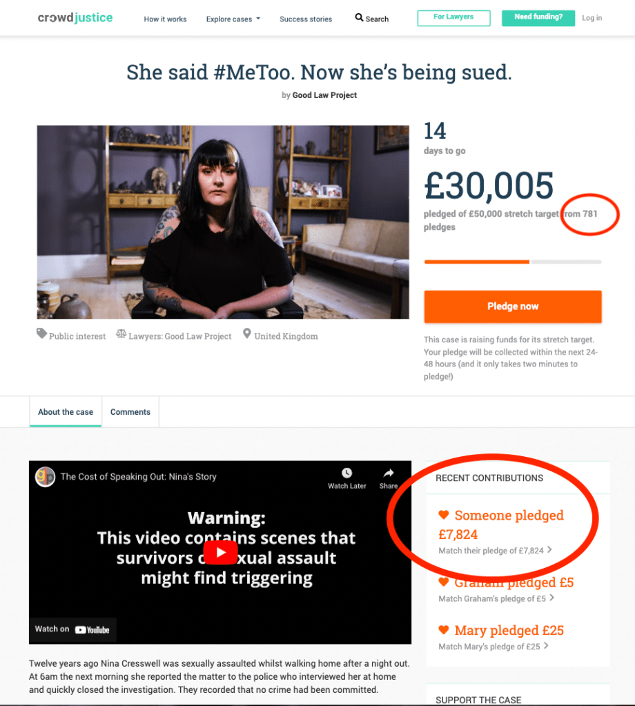 On 11 October 2022, the GLP launched a new crowdfunder – their 50th – in support of legal action on behalf of Nina Cresswell, who is being sued by a man she has publicly accused of sexually assaulting her 12 years ago. This stated that “so far we have spent £8,583 of our own funds getting legal advice for [Ms Cresswell], and defending her in court will cost a further £50,000”. And it set out an initial target of £30K, to be met within 30 days: “Your card will only be charged if the case meets its target of £30,000 by 1pm [on 10 November 2022]”.