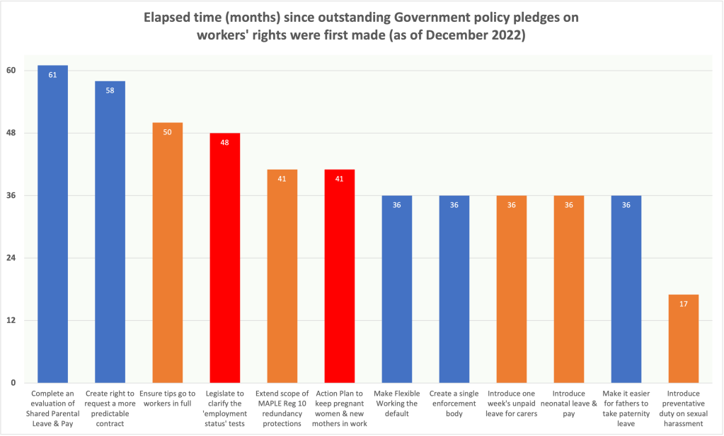 There are no signs of the Government introducing the new right to request a more predictable and stable contract that was first promised in February 2018, despite the Minister confirming as recently as late October that the Government “remains committed” to this pledge. Similarly, there are no signs of any progress on the December 2019 pledge to “make it easier for fathers to take paternity leave”. And there’s been no real news on the promised Single Enforcement Body since June 2021.