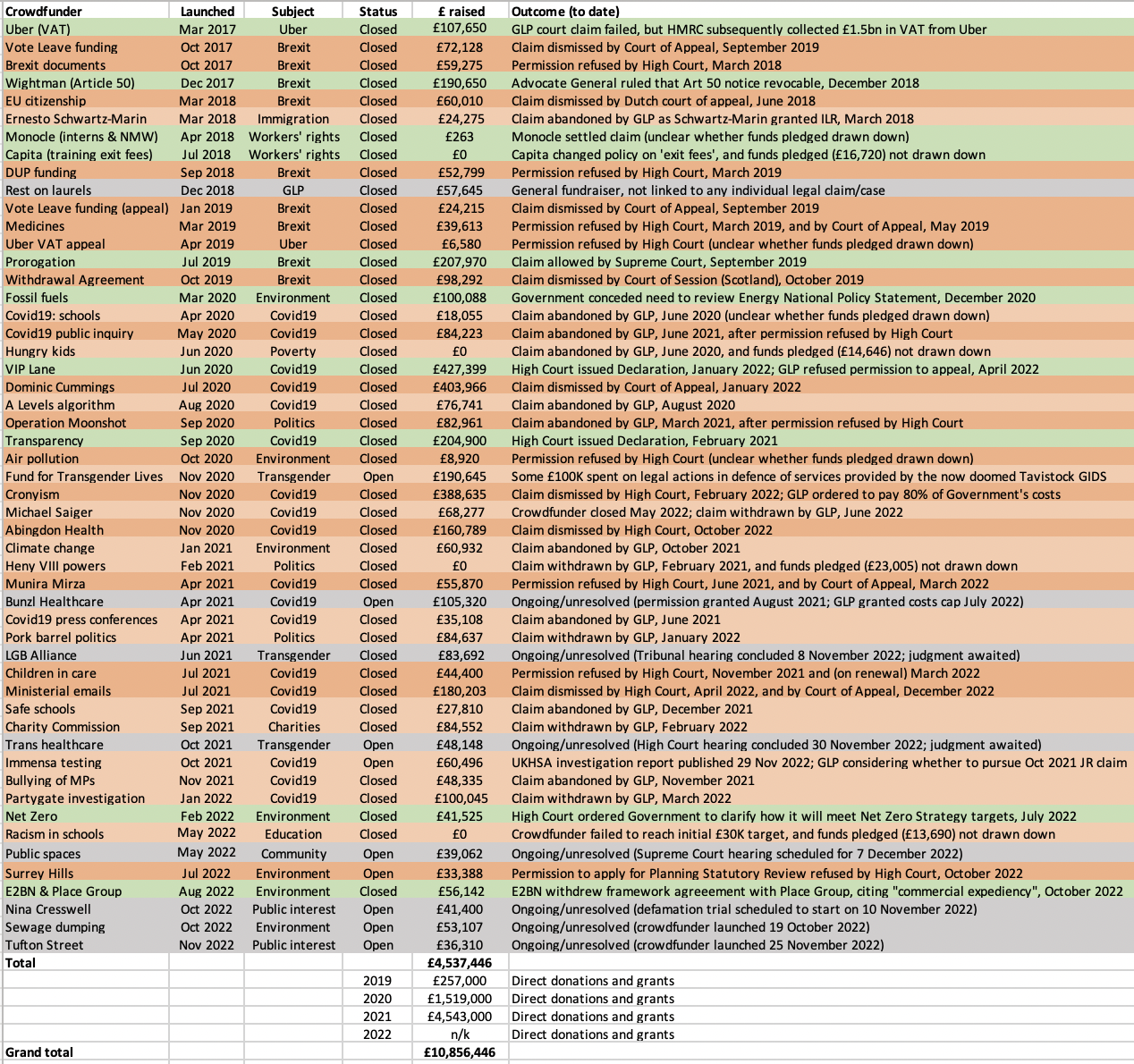 Whatever, here’s my own, updated Table of Failure & Futility, showing the sum raised by and outcome to date of the GLP’s 52 Crowdjustice crowdfunders since 2017: