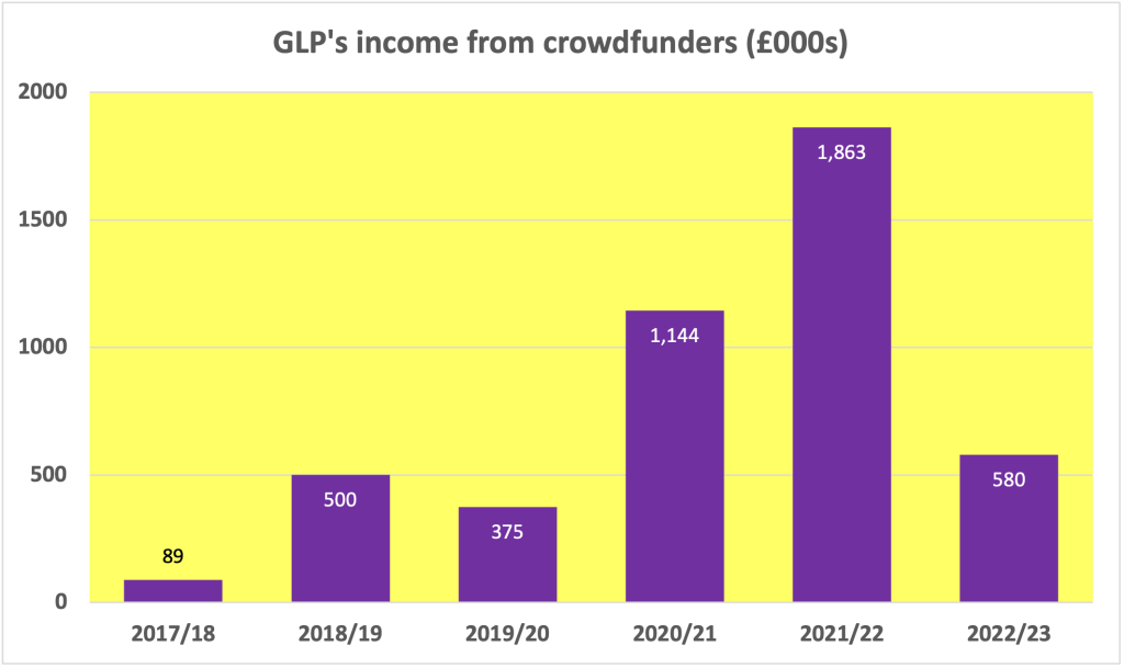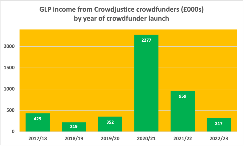 Indeed, while there are still four weeks to go until the end of the GLP’s 2022/23 reporting period (which runs from 1 February to 31 January), total income from Crowdjustice crowdfunders has slumped from £1.144 million in 2020/21 and £1.863 million in 2021/22, to just £580K in 2022/23 to date. And £263K (45%) of that £580K came through crowdfunders launched in previous years.