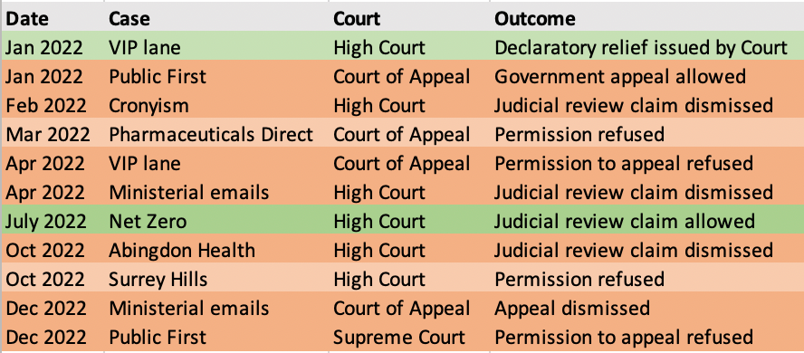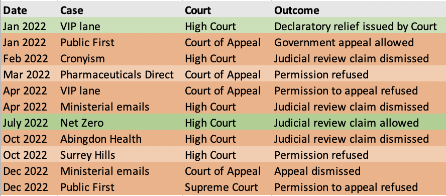 In October, the High Court dismissed the GLP’s attempt to challenge the award of contracts for Covid antibody tests to the specialist rapid test manufacturer Abingdon Health; once again, the Court not only dismissed the GLP’s judicial review claim in its entirety, but went on to rule that the GLP lacks standing to bring such claims. And, in December, the Court of Appeal dismissed the GLP’s appeal in the ‘ministerial emails’ case, and then the Supreme Court refused the GLP permission to appeal the Court of Appeal’s January 2022 ruling in the Public First case.