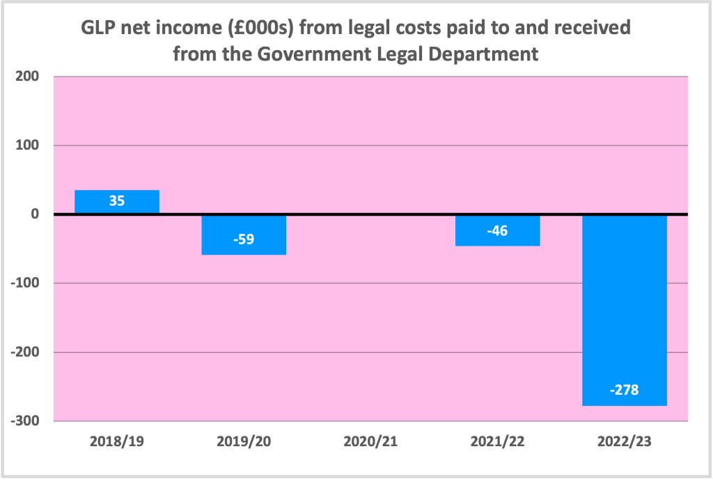Update 16 January: And today I received a response from the Government Legal Department to my own FoI request, put in just before Christmas, asking for a breakdown of legal costs paid to and received from the GLP by the Government in each year since 2017 (GLD ref: FOI 296). And, while this appears not to include legal costs paid directly to and received directly from the GLP by government departments other than the Government Legal Department, it paints yet another less than pretty picture, from the GLP’s point of view: