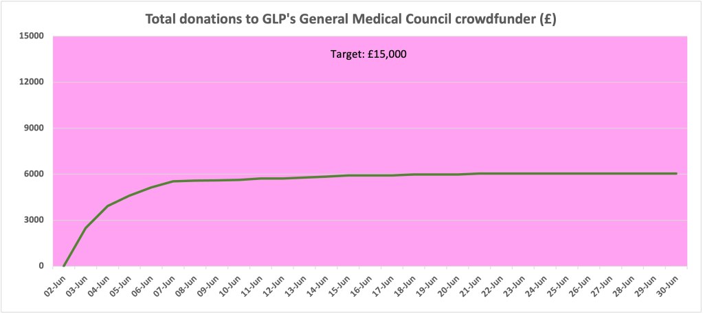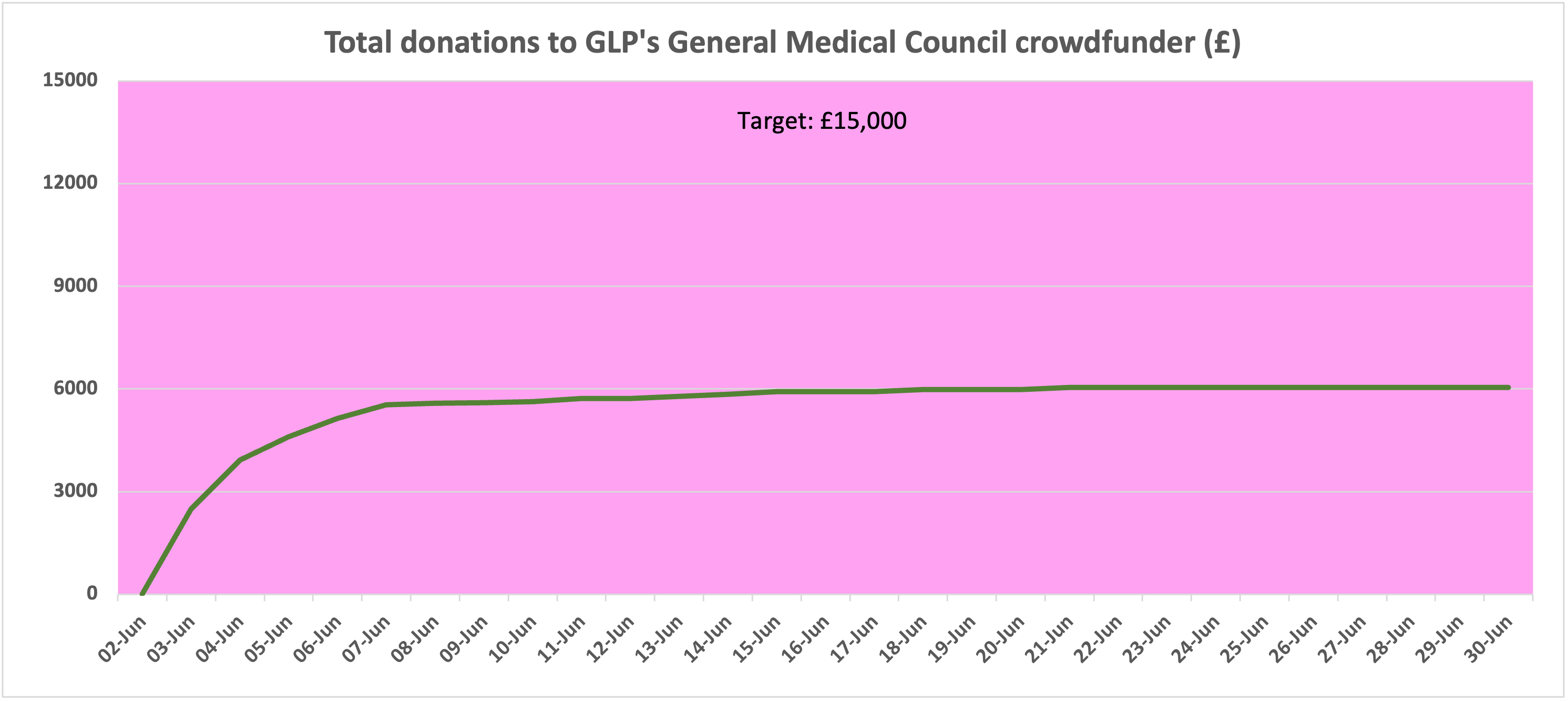 On 2 June, the GLP launched a new, in-house crowdfunder, with an initial target of £15,000, in support of legal action against the General Medical Council relating to alleged vaccine misinformation by doctors. However, donations have flatlined since 7 June.