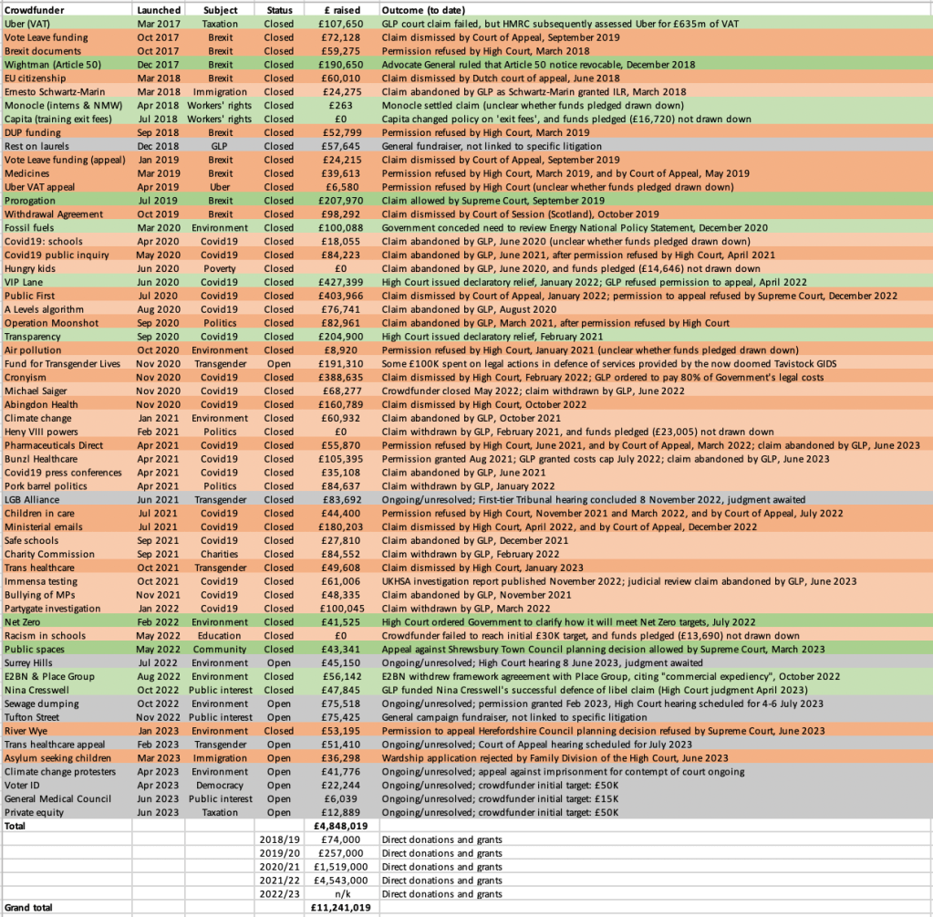 - Two longstanding but moribund crowdfunders closed by the GLP, and the associated judicial review claims later abandoned
