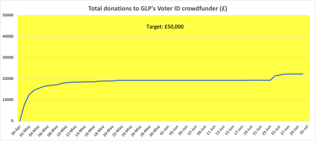 Similarly, donations to an in-house crowdfunder launched on 30 April, in support of a potential legal challenge to the Voter ID provisions of the Election Act 2022, flatlined from mid-May until 23 June, when the GLP emailed supporters to seek donations on the back of an interim report, published earlier that day, by the Electoral Commission on the local elections held on 4 May. In late 2022, the GLP advised their supporters that “a legal challenge [to the Voter ID provisions] is likely to be difficult due to obstacles in obtaining sufficient evidence”. But they now say they are “bringing legal action on the issue”.