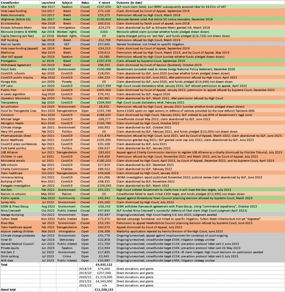 This table shows the sum raised by and outcome to date of the GLP’s 62 crowdfunders since March 2017. Dark orange = court defeat; light orange = other negative/unproductive outcome; dark green = court win; light green = other positive outcome; grey = in progress/unresolved/other.