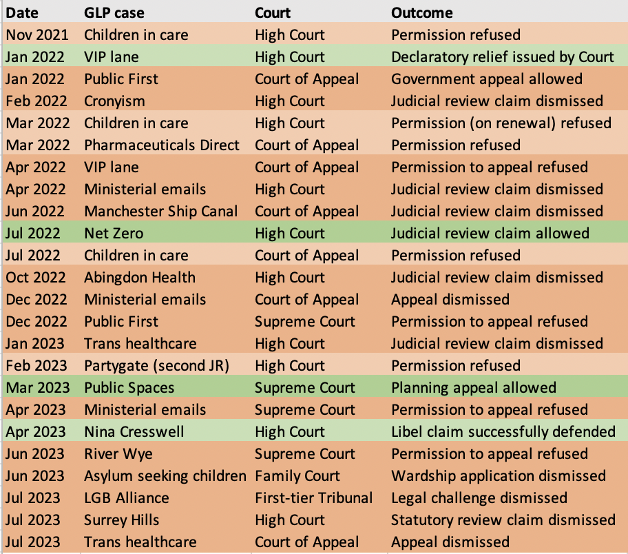 Updated table of court outcomes in GLP cases since 1 October 2021 (i.e. the start of the 2021/22 legal year):
