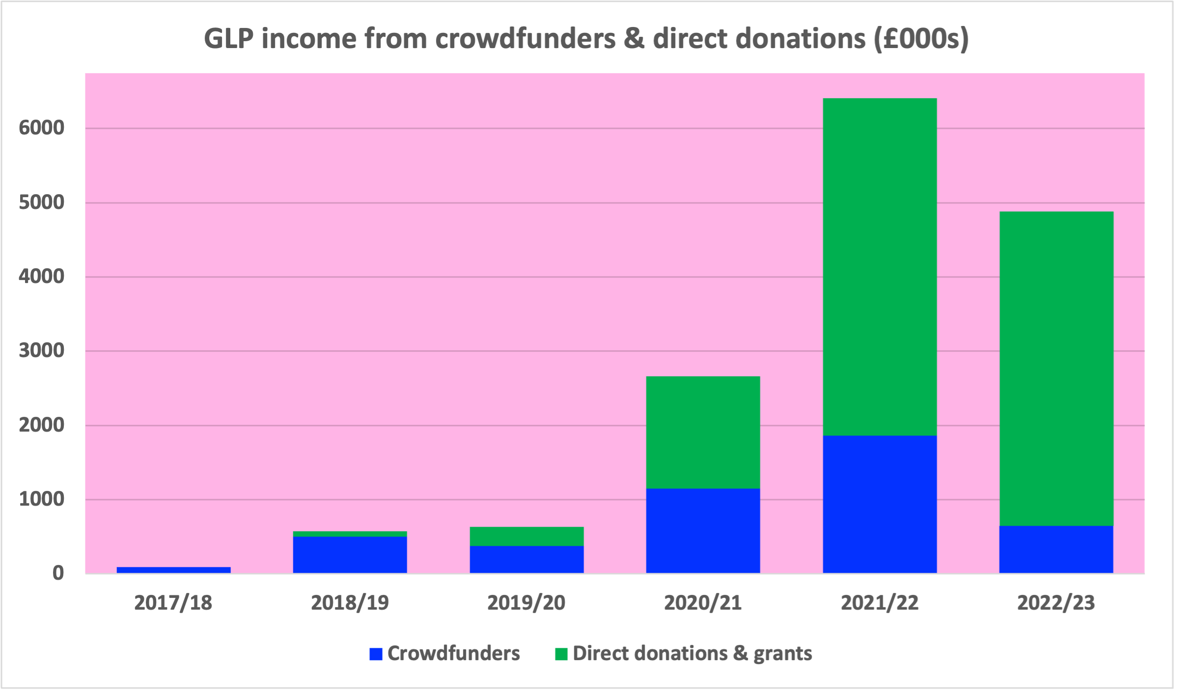 On 11 September, the GLP published their annual report and accounts for 2022/23 (i.e. up to 31 January 2023). This reveals that, after four years of remarkable growth, income from direct donations and grants levelled off in 2022/23, at a hefty £4.241 million (some £300K less than in 2021/22). And, with income from crowdfunders down from £1.863 million in 2021/22 to £644K in 2022/23, total income from crowdfunders, direct donations and grants was down 24%, from £6.406 million to a still very healthy £4.885 million.