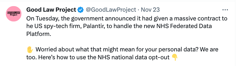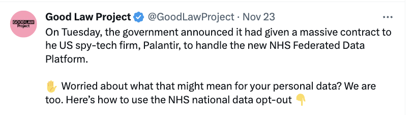 The GLP tweet was posted on 23 November, two days after NHS England announced the awarding of a £330m contract to deliver a federated data platform (FDP) to the US-based tech company Palantir. NHS England say that the FDP will “join up key information currently held in separate NHS systems” and allow staff to “plan and maximise resources such as operating theatre and outpatient clinic time to ensure patients receive more timely care”, but the GLP say that “the way in which NHS data is currently processed lacks transparency and … we expect the situation to get worse now Palantir is in charge”.