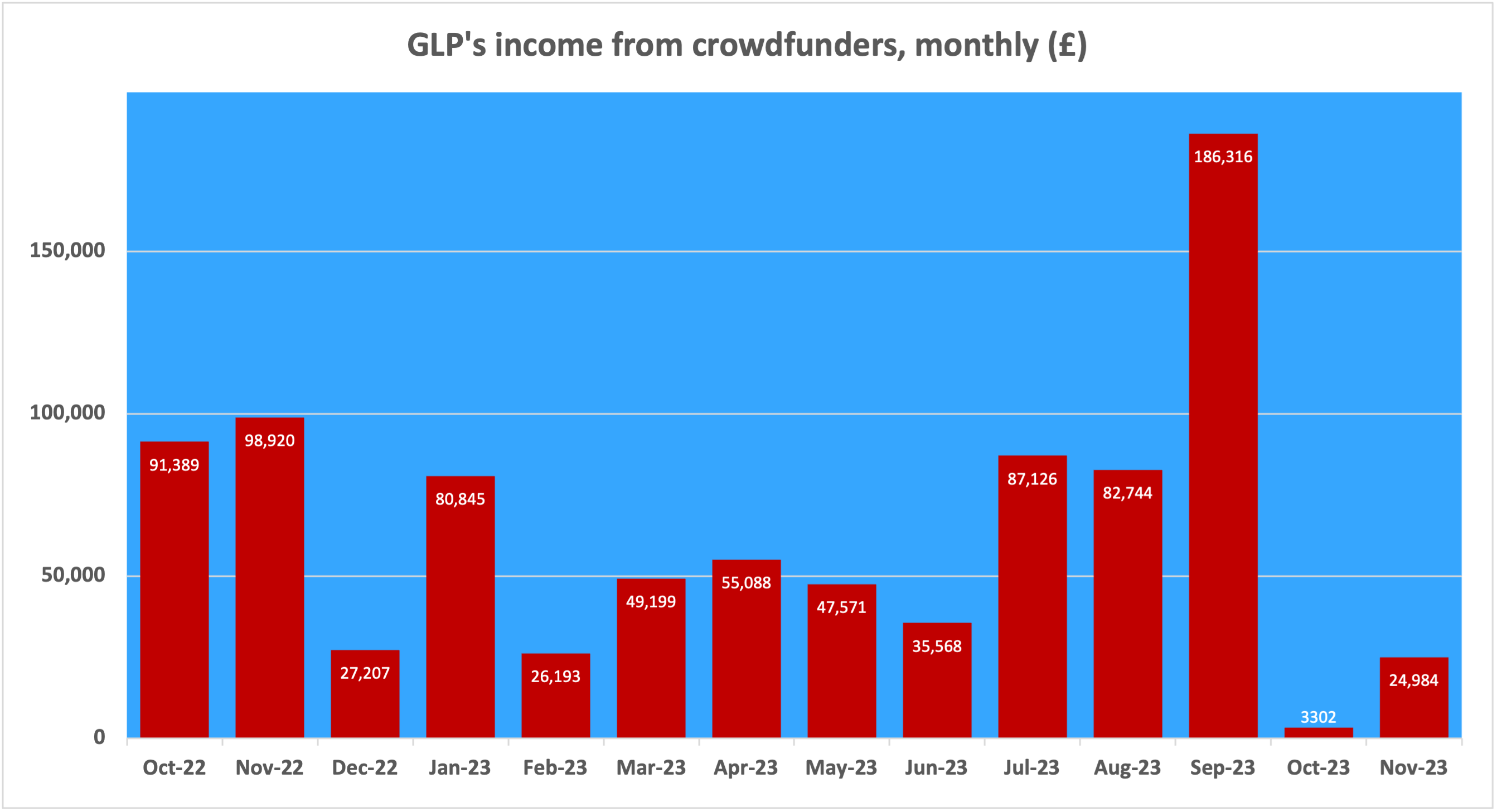 - The GLP raised £186,316 from crowdfunders in September, but just £3,302 in October, and £24,984 in November