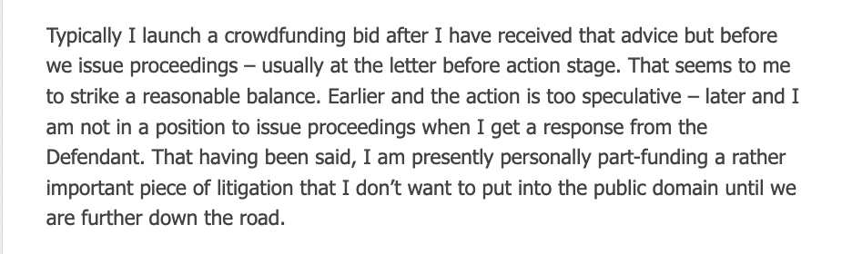 And you don’t have to be a cynical, paid Tory troll like me to take that view. Way back in November 2017, no less a person than Jolyon himself explained that this is exactly why he tends to launch his many crowdfunders – an industrial-scale 69 of them since March 2017 – after sending a letter before claim, but before getting the proposed defendant’s response to that letter before claim: