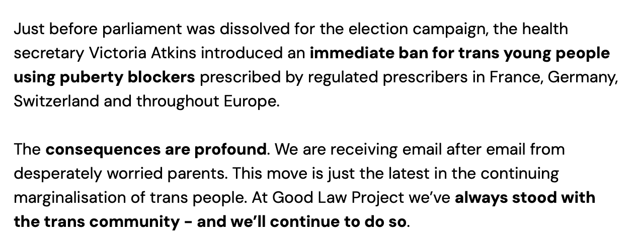 Somewhat surprisingly, the opening paragraph of the email uses the original, factually incorrect wording of the crowdfunder text – wrongly suggesting that the ban is on young trans people “using” puberty blockers – rather than the revised text that the GLP posted to the crowdfunder page on 6 June (see above). The factually incorrect (and therefore misleading) words are even highlighted in bold: