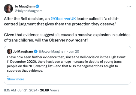 On 20 and 21 June, both Maugham and the GLP doubled down on their unsubstantiated claims about the number of suicides among trans-identifying young people, with Maugham posting a 34-post thread on X/Twitter, and the GLP posting a news item on their website and sending a further email to some or all of the more than 300,000 people on their mailing list.