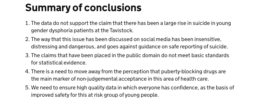These highly emotive paragraphs – including the bald assertion that the ban “is likely to” cause the suicide of trans-identifying young people, and the implicit suggestion of an NHS cover-up – are not just extremely partisan, but grossly irresponsible (and seemingly contrary to the Samaritans’ guidelines on reporting suicide). Because such monetising of the (alleged but unsubstantiated) suicides of young and quite possibly seriously mentally ill young people is reckless if not dangerous. As a Government adviser on suicide prevention and mental health noted today: “alarming claims about suicide may be not only misleading but harmful. More so if they highlight a single cause those already at risk may identify with. Suicide is complex.”