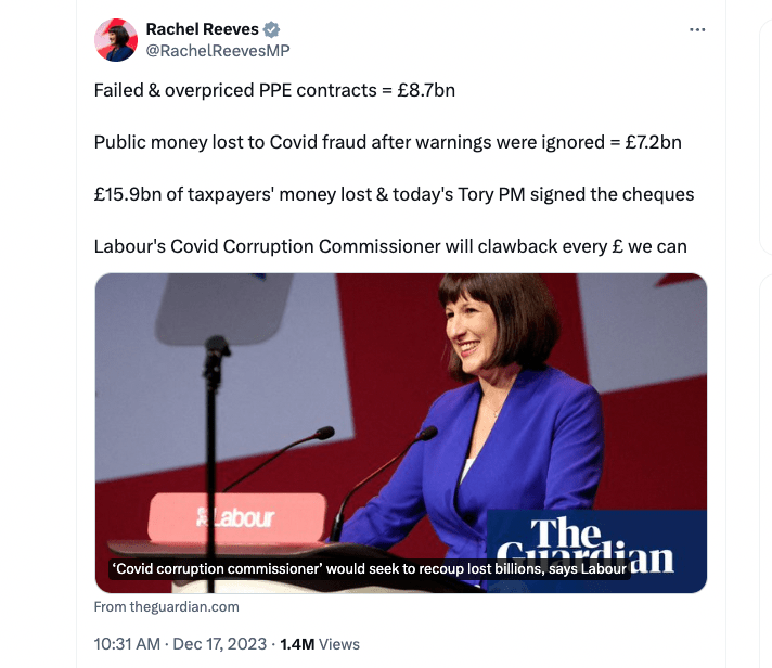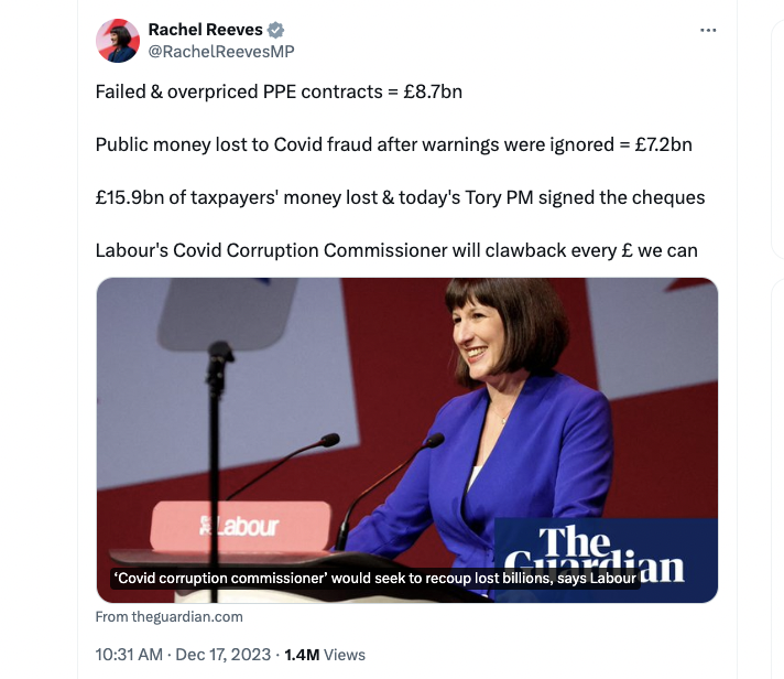 And, (approvingly) posting the above Guardian report on X/Twitter, Reeves said: “Labour will appoint a Covid Corruption Commissioner to recover billions lost to waste and fraud.”