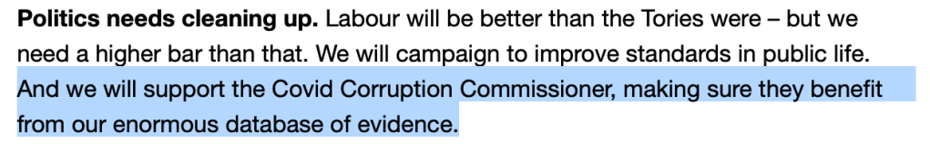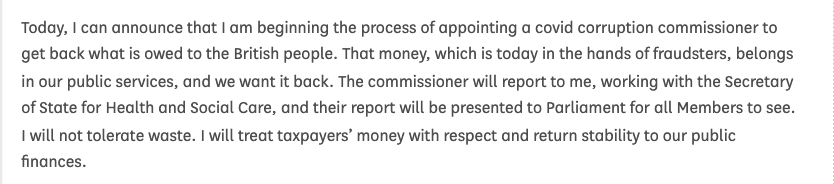 We will appoint a fixed-term Covid Corruption Commissioner and use every means possible to recoup public money lost in pandemic-related fraud and from contracts which have not delivered.