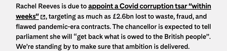 The Guardian reports that Reeves is “understood to believe the Treasury can recoup £2.6 billion from waste, fraud and flawed contracts signed during the pandemic”, and will appoint a Commissioner “within weeks”. However, there is no mention of ‘powerful powers’, or any hit squad of investigators.