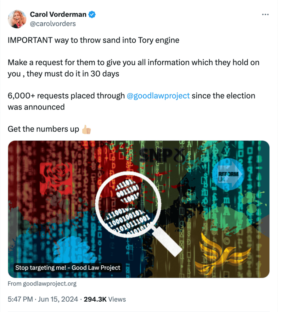 Twice, on 15 June and 17 June, the TV celebrity Carol Vorderman, who works closely with the GLP, urged her 990,000 followers on X/Twitter to use the GLP’s online tool to send a data SAR to the Conservative Party, simply to “throw sand into the Tory engine”. “Sign up if you fancy”, Vorderman urged her followers on 17 June.