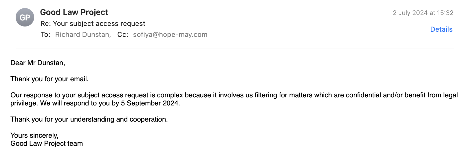 As ‘requiring time to consider and apply exemptions’ is not among the “examples of factors that may, in some circumstances, add to the complexity of a request” set out in the ICO guidance for organisations on when a data SAR is complex, on 2 July I emailed the GLP asking them to clarify, with reference to the ICO guidance and the Good Law Project’s own stated values, why they consider my data SAR to be complex. And later the same day the GLP replied, claiming that my data SAR is complex “because it involves us filtering for matters which are confidential and/or benefit from legal privilege”.