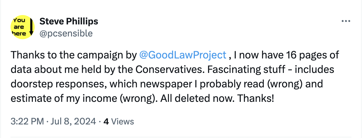 Not only is it unclear what, if anything, this deluge of GLP-facilitated data SARs achieved, but it’s far from clear what Jolyon and the GLP hoped or expected it would achieve. The GLP last promoted the online tool on X/Twitter on 1 July, and haven’t mentioned it or the ‘broader campaign’ since. The Conservative Party is diligently processing each of the 11,000 data SARs, so it seems the GLP will not, as threatened, be taking the Tories – or any other political party – to court, and the online tool has been removed from the GLP’s website, which now simply states:
