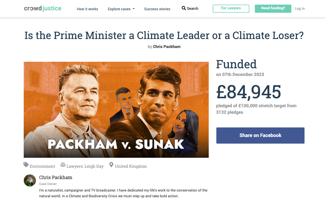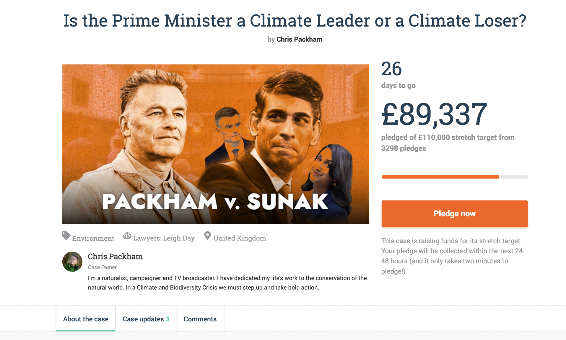 As documented on this blog in January, Packham launched his crowdfunder on Crowdjustice on 4 December, with an initial target of £75,000, to cover the legal costs of launching a judicial review of the then Tory government’s decisions to “abandon statutory green pledges made in its latest carbon budget to keep the UK on target for Net Zero” and in particular to “delay or abandon key climate targets around vehicles and gas boilers”. In a video posted on social media, Packham boldly claimed that his case “could set a precedent that our leaders or their Governments cannot act on a whim without facing the legal consequences”.